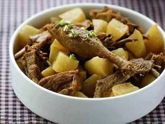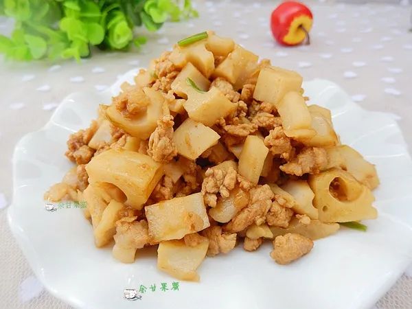 肉沫藕丁、金银芝麻米饭、萝卜炖鸭、鲫鱼小白菜粉丝汤