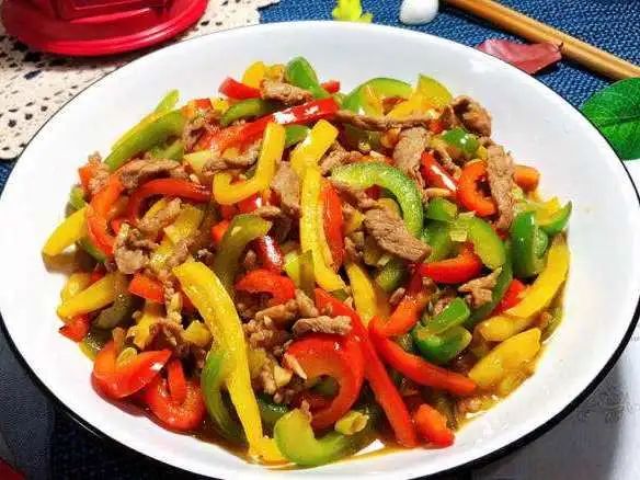 金银米饭、甜椒炒肉、五彩豆腐
