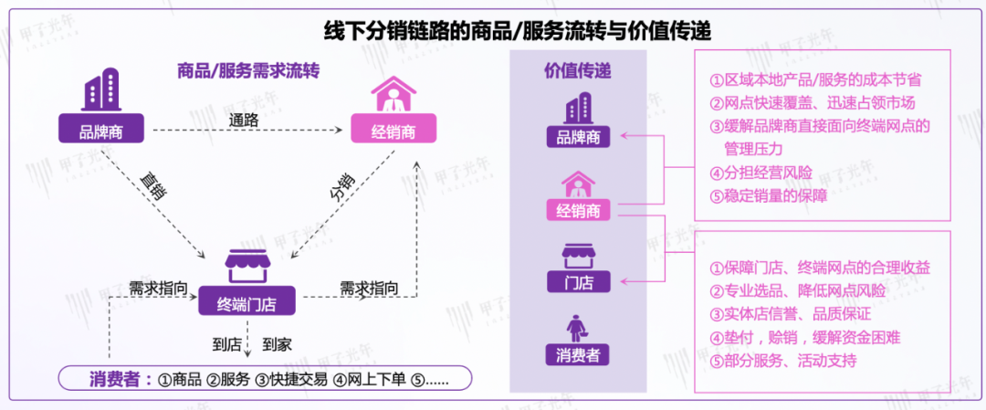 从当前线下分销模式的价值链(如下图)可以看出,经销商是整个线下分销链路中的重要环节,是商品流通和价值传递的枢纽。从数字化能力的角度来说,品牌商因为往往有足够的IT预算进行信息化和数字化的建设,而终端门店过去几年在互联网巨头和新零售趋势下受数字化的熏陶和影响非常大,对数字化的认识和使用水平到了一个不错的水平。所以经销商反而是整个价值链中数字化能力最弱的一环,成为线下分销链路数据贯通的黑洞。