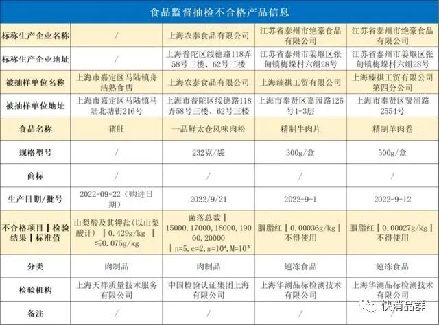 一品鲜太仓风味肉松(生产商上海农泰食品有限公司、销售商上海农泰食品有限公司),不合格项目:菌落总数;