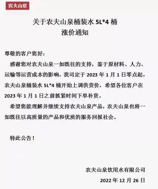 2023年2月1日,一张农夫山泉《杭州区域19升水调价通知》在业界流传。根据《通知》内容,自2023年2月1日起,杭州市农夫山泉19L规格桶装水零售价由此前的20元/桶提高至22元/桶,调价幅度为10%。