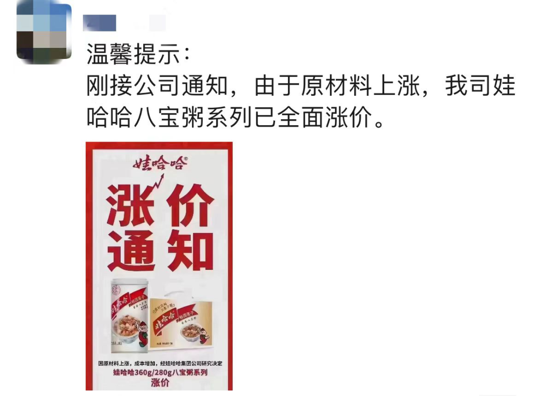 从2月起,娃哈哈经典产品360八宝粥系列、280八宝粥系列产品全面涨价,涨价幅度每箱2元。据经销商反馈,目前只是口头通知,本月或将出具书面通知。