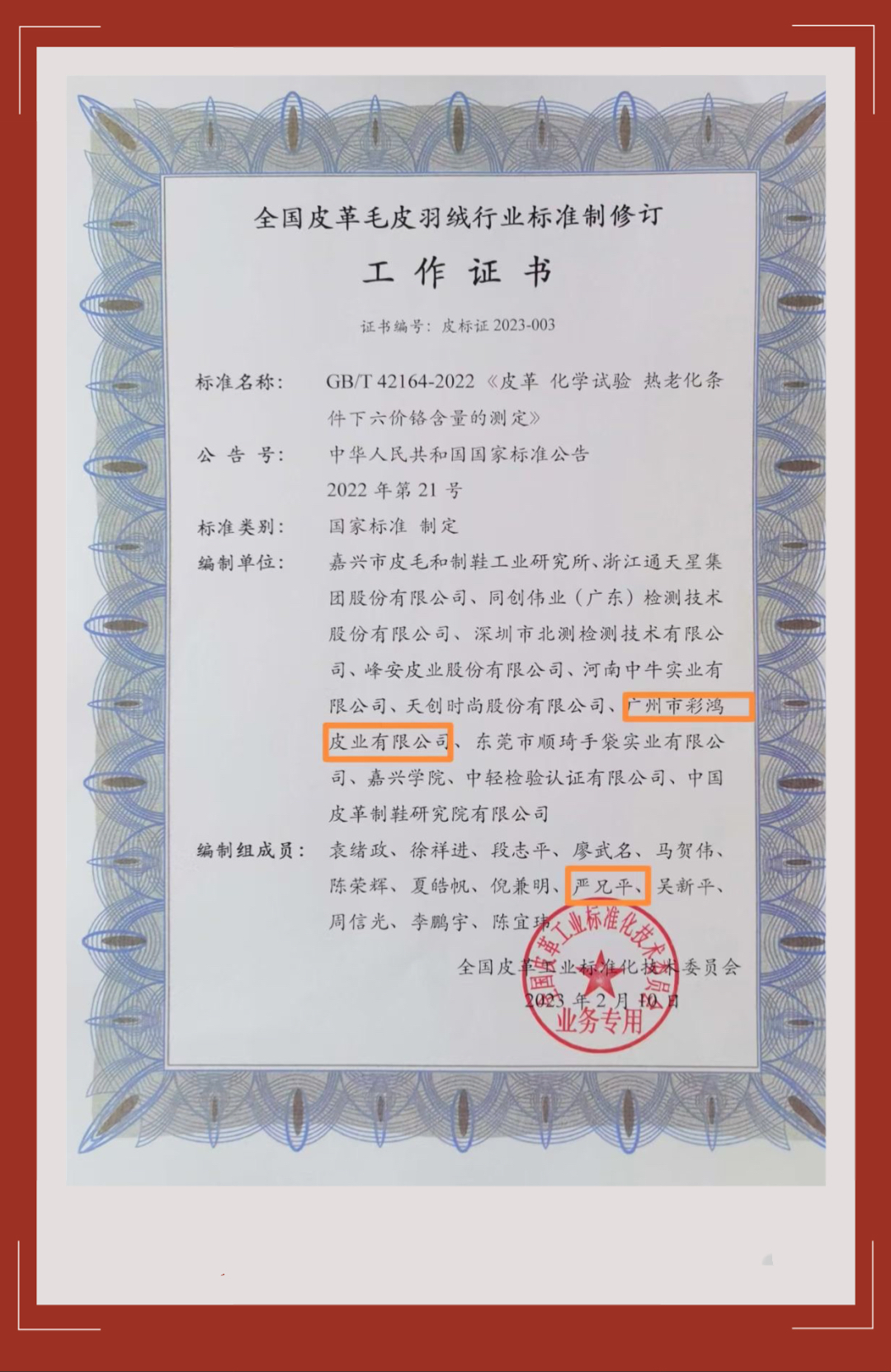衷心感谢严兄平董事长、黎彩红总经理多年来对商会的大力支持!祝福彩鸿皮革新年新气象!财源广进!大展宏图!