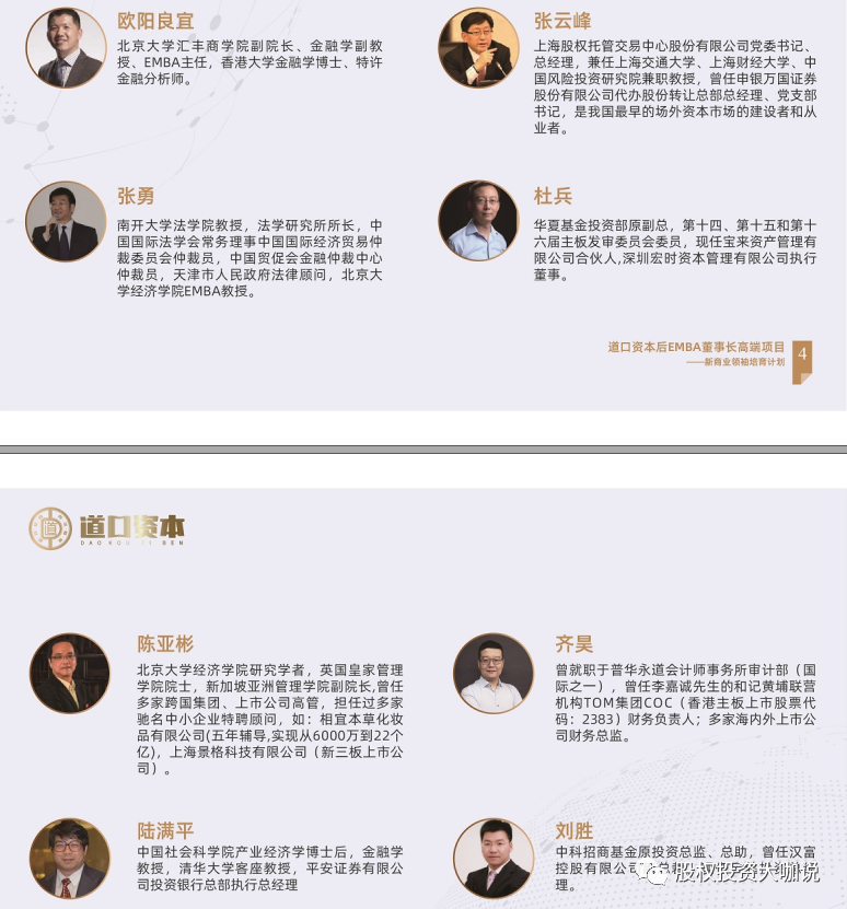 新商业领袖高端项目依托清华五道口资源,调研已毕业十七期投融资班企业家校友,再度对“资本后EMBA”课程迭代升级。课程着重关注资本赋能和商业创新两大核心主题,邀请众多顶尖金融学教授、权威政策制定者和资本业界大咖导师,共同打造全方位浸润式学习体验,赋能中国企业实现价值再造,取势领跑未来。