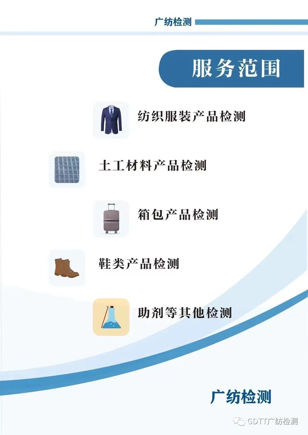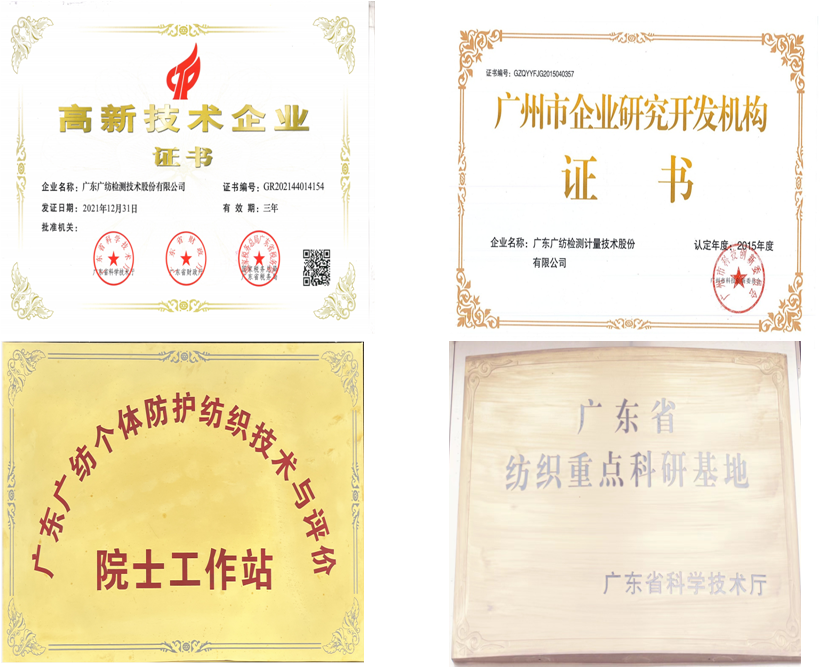 广纺检测为国家级高新技术企业,是广州市企业研究开发机构,广东省纺织重点科研基地,广州市中小企业公共技术服务示范平台、广东省外贸纺织品研发及检验公共服务平台、广东广纺个体防护纺织技术与评价院士工作站等。广纺检测将凭借完备的资质能力、完整的技术能力、优质的服务保障、权威的公信力和便捷的全国化服务网络,为各产业提供一站式整体技术解决方案和热忱、全面的专业测试服务。广东广纺检测技术股份有限公司(简称:广纺检测)的前身为广州市纺织工业研究所,于1959年11月成立,是一家集检测、咨询、培训为一体的综合性第三方检测机构,下设纺织品检验中心、广州市无纺布产品质量检验中心、土工材料检验中心、鞋类及箱包检验中心,在纤维、纱线、面料、服装、服饰、箱包及鞋类、皮革制品、土工合成材料等领域为企业提供一站式服务。科学城业务接待室 电话:020-61302688