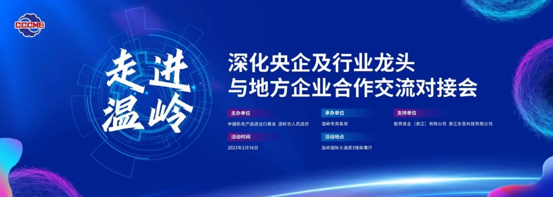 2月16日,由中国机电产品进出口商会、温岭市人民政府主办,温岭市商务局承办的“走进温岭——深化央企及行业龙头与地方企业合作交流对接会”在温岭市成功举办。