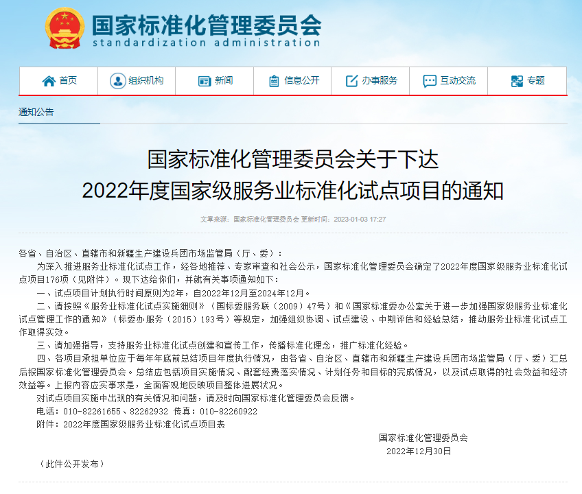 据了解,国家级服务业标准化试点项目是由国家标准化管理委员会面向全国各地征集,旨在深入贯彻落实《国家标准化发展纲要》,巩固国家级服务业标准化试点建设成果,推广标准化经验。试点项目建设周期一般为2年。