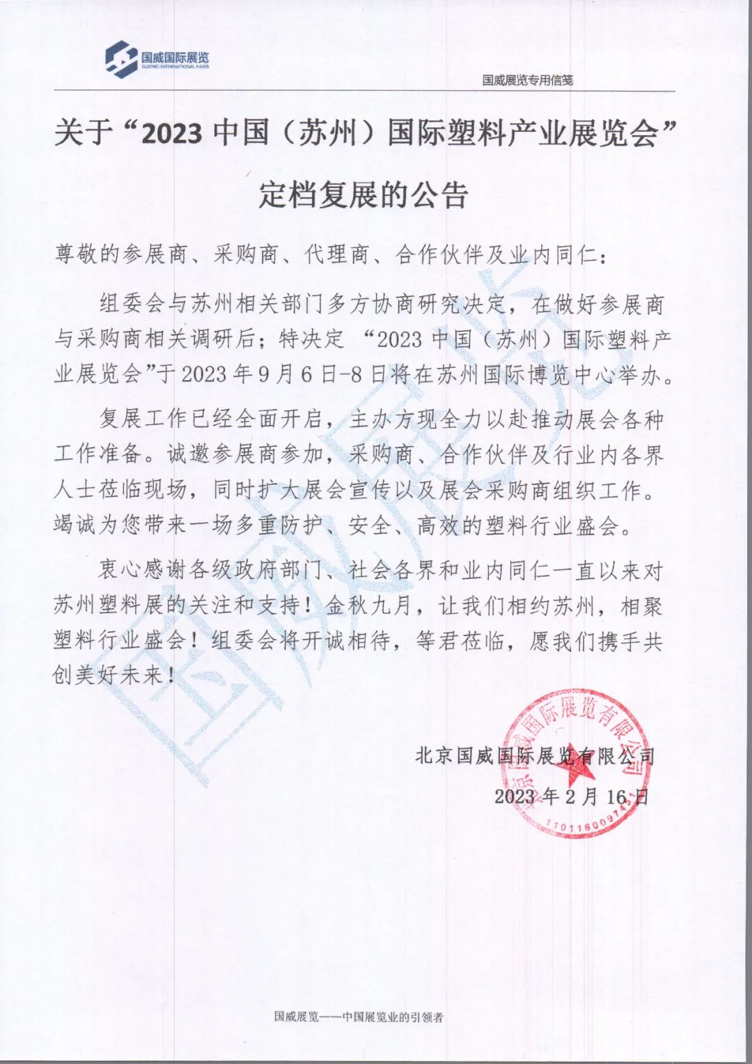 组委会与苏州相关部门多方协商研究决定,在做好参展商与采购商相关调研后;特决定 “2023中国(苏州)国际塑料产业展览会”于2023年9月6日-8日将在苏州国际博览中心举办。