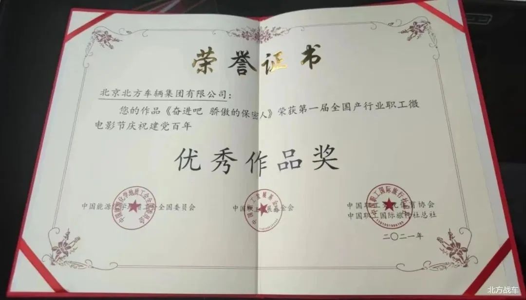 2月17日,第一届全国产行业职工微电影节在北京亦庄举行,北方车辆集团党委副书记、纪委书记、工会主席吴简出席了颁奖典礼。公司自编自导、认真组织、精心策划,历时数周制作完成的微视频作品《奋进吧 骄傲的保密人》斩获佳绩,荣获“庆祝建党百年优秀作品奖”。