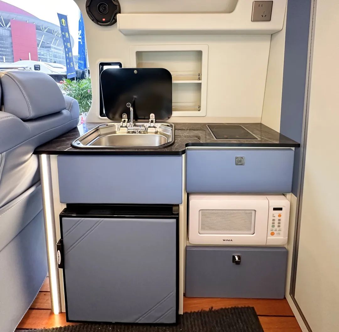 厨房区位于车门旁,配备有带盖板洗菜池、水龙头、电磁炉、49L冰箱、微波炉和储物柜,上方是经过内嵌处理的家用空调。