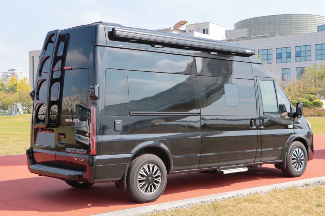 这款房车基于新世代全顺打造,康旅对前脸进行了改装,银色贯穿式进气格栅,加上蜂窝纹路设计,不仅更有商务范,辨识度也更高。LED大灯和全新的轮毂也提升了档次感。实拍车型车身外侧还配备有遮阳棚、踏步、后爬梯等。