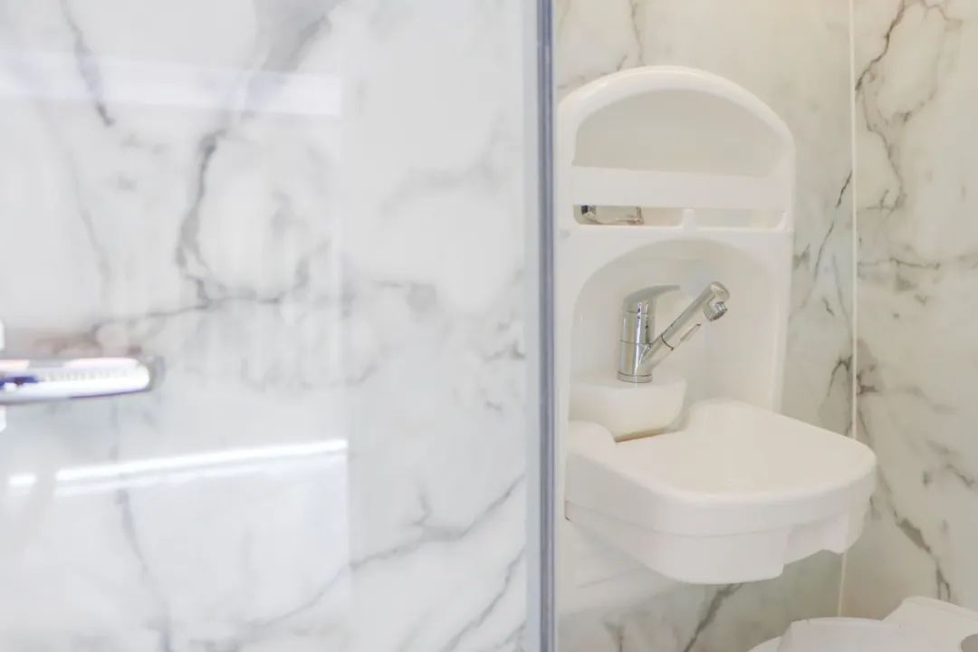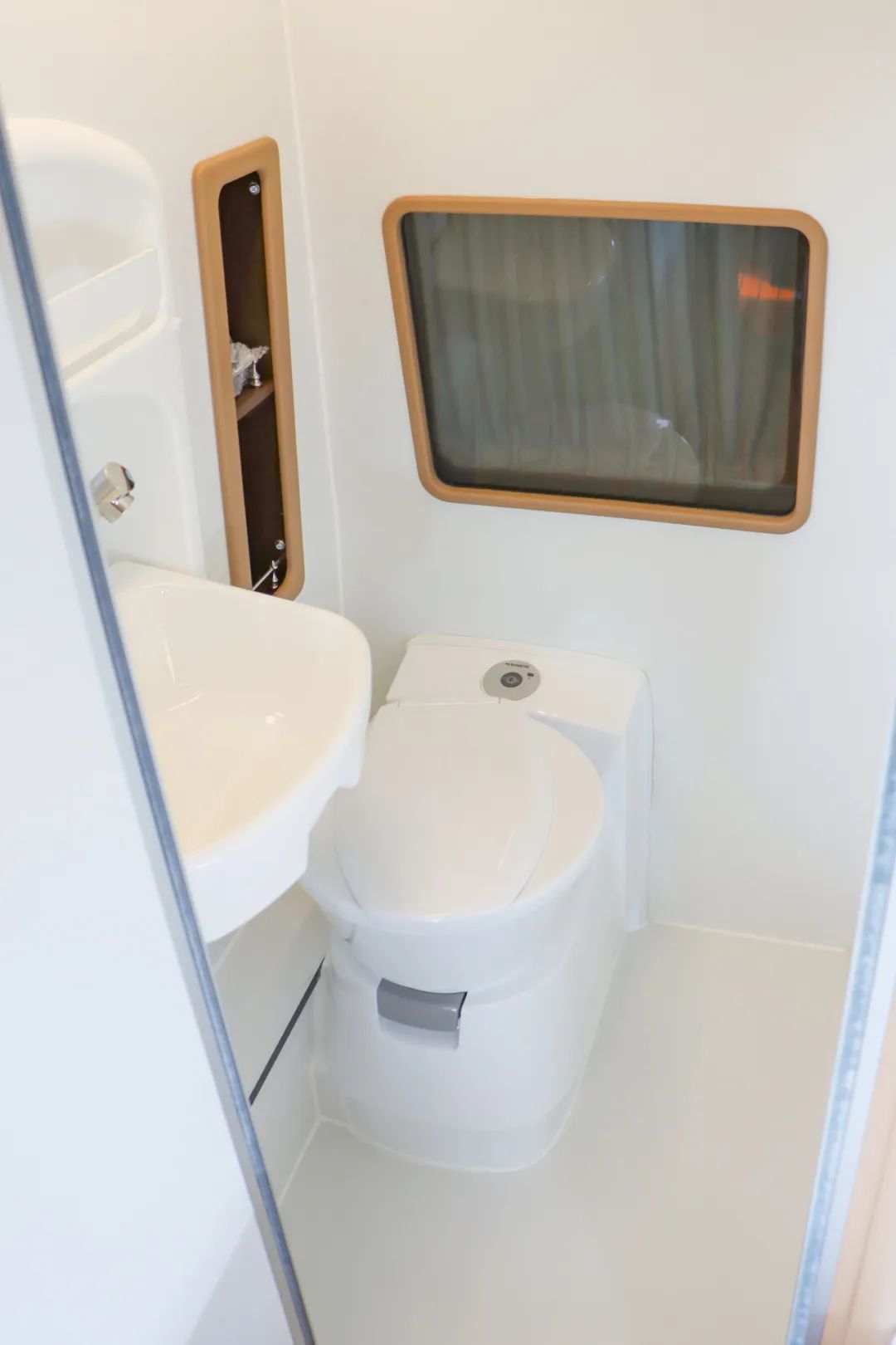 卫浴间在车尾另一侧,配备有折叠洗手池、抽拉水龙头、马桶和换气扇等。水电系统方面这款房车配备有140L净水箱、51L灰水箱、600Ah锂电池、3000W的逆变器、400W太阳能等。