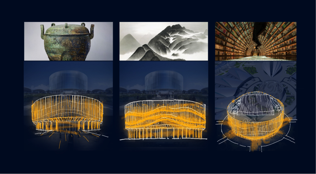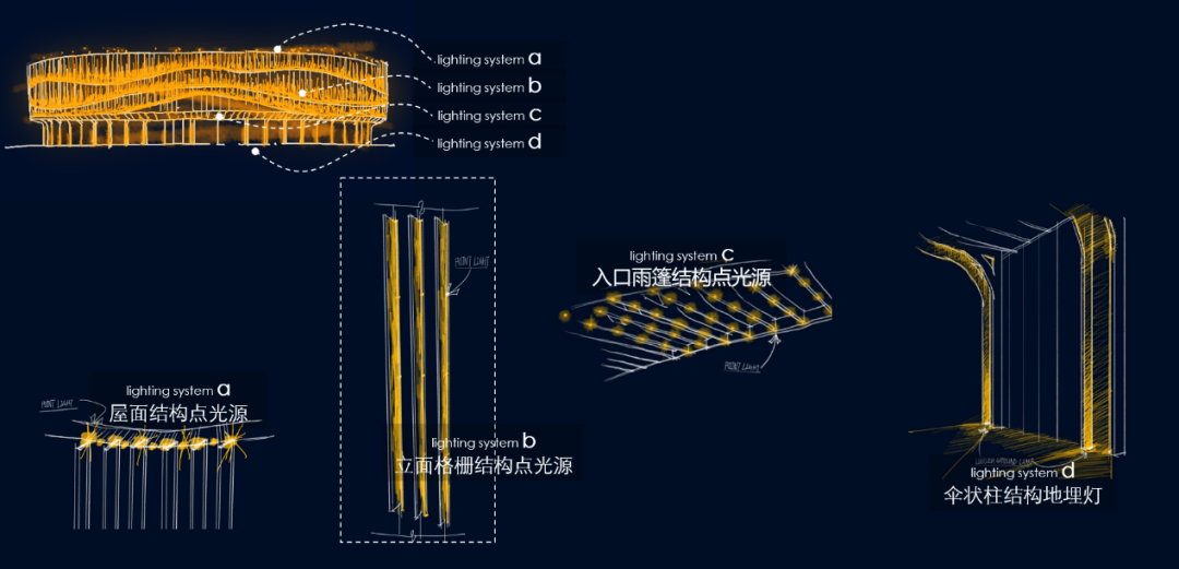 武汉国博会展工程完善提升工程项目是为了优化国博中心的流程和功能,在现有场地的中心花园建设具备登陆、开幕、会议等功能一体化的多功能会议厅建筑,建筑泛光照明的配套设计为该建筑的功能性与地标性奏响了开拓发展新乐章。国博汉厅着眼于后疫情时代的武汉新面貌,有着“代言武汉、点睛国博、传扬荆楚”的定位。建筑的设计上以“山川鼎秀,寒梅报春”的理念为引导,突出时代精神与文化脉络。项目设计时充分解读建筑设计理念和业主要求,决定尊重并延续建筑取意山水的设计理念,泛光照明设计创新采用点光源投光成漫反射光效的照明手法来呈现名作《千里江山图》等山水画卷。设计概念手绘图
