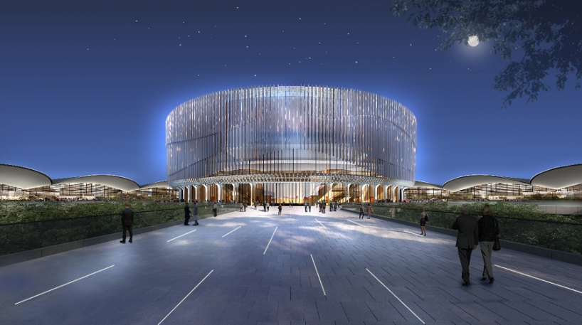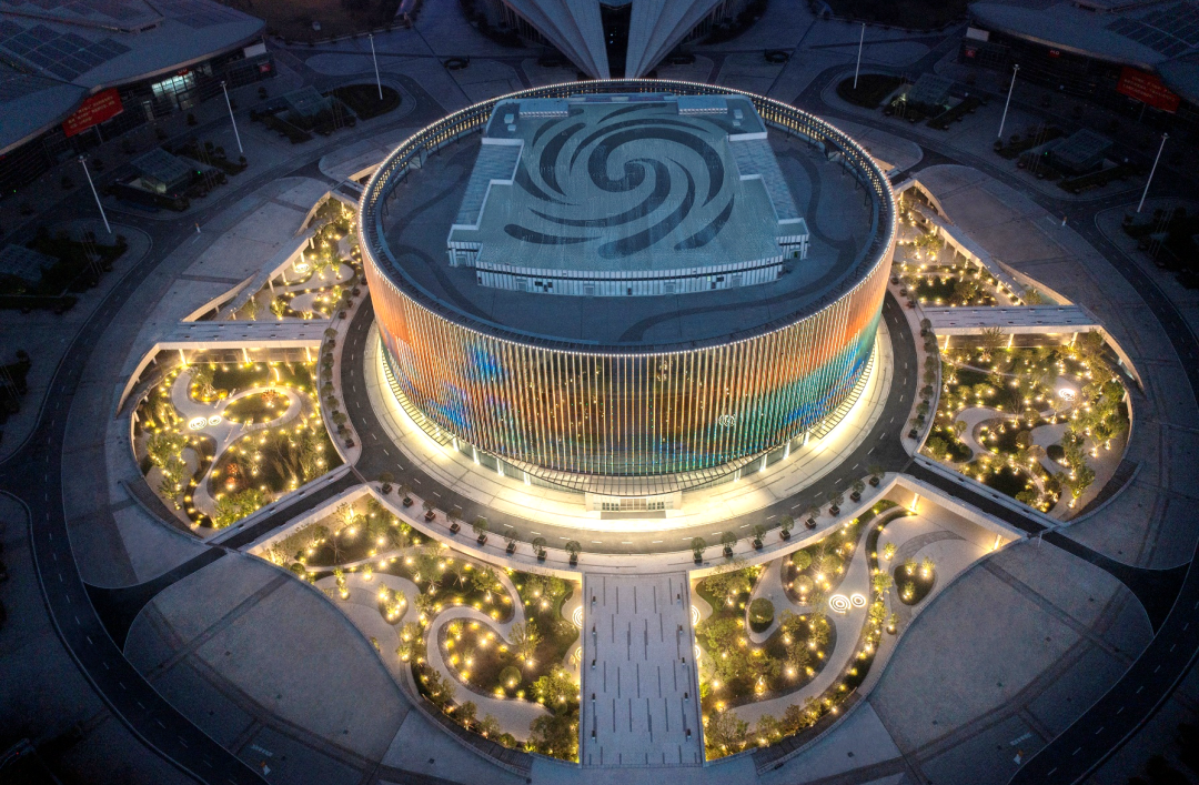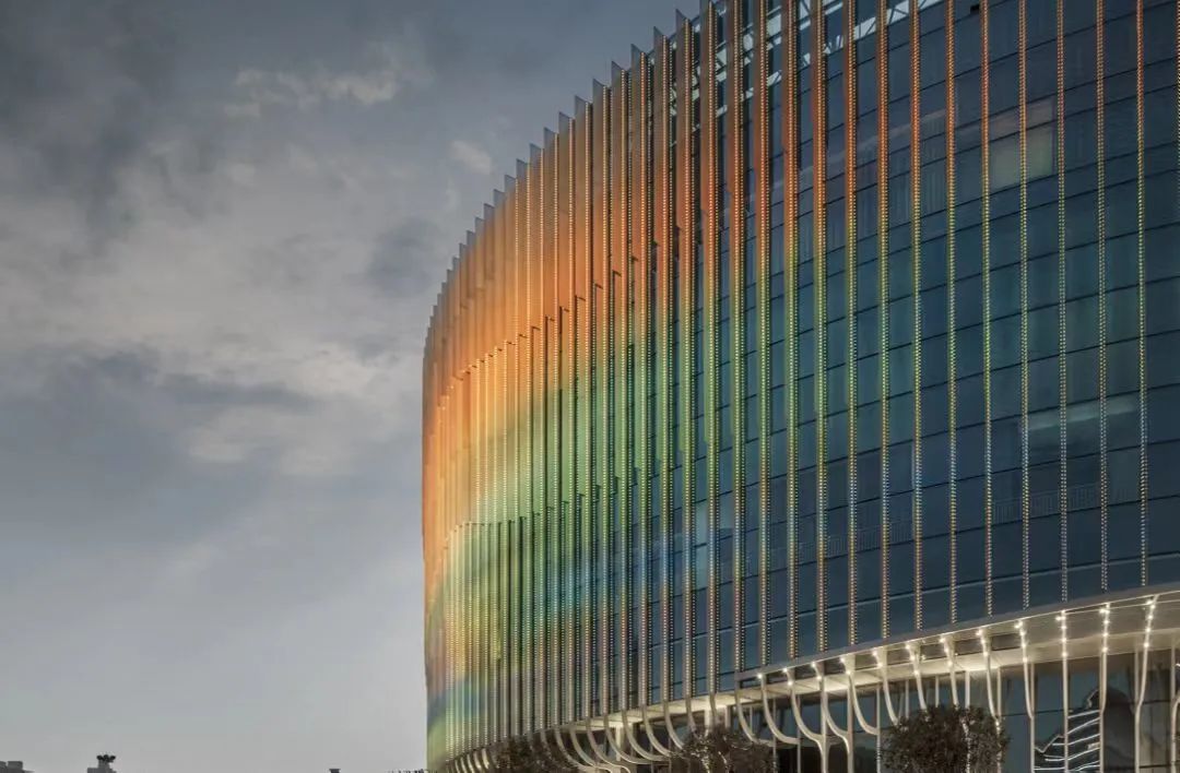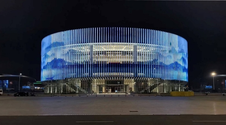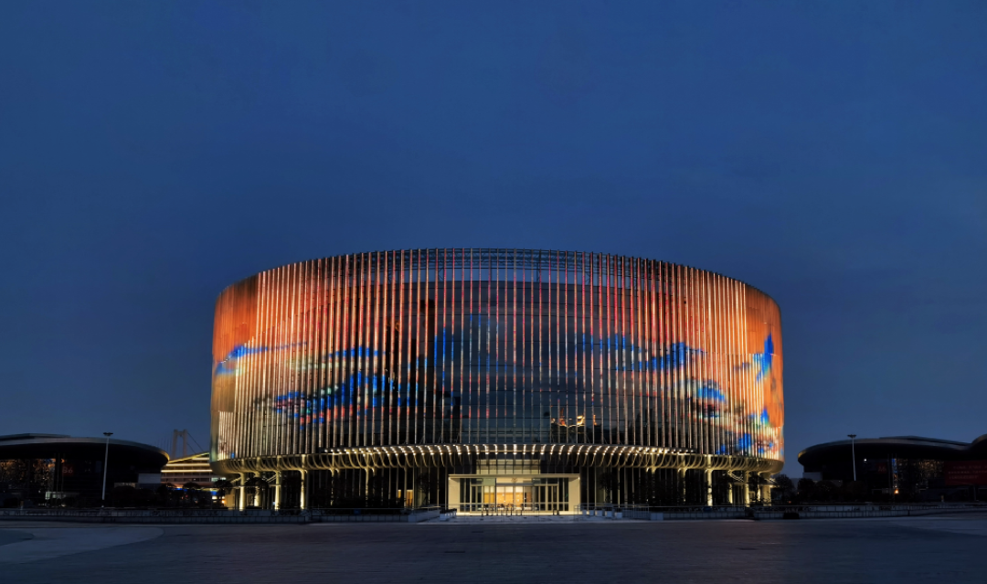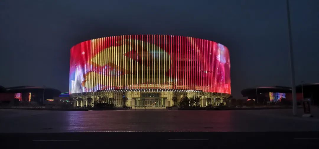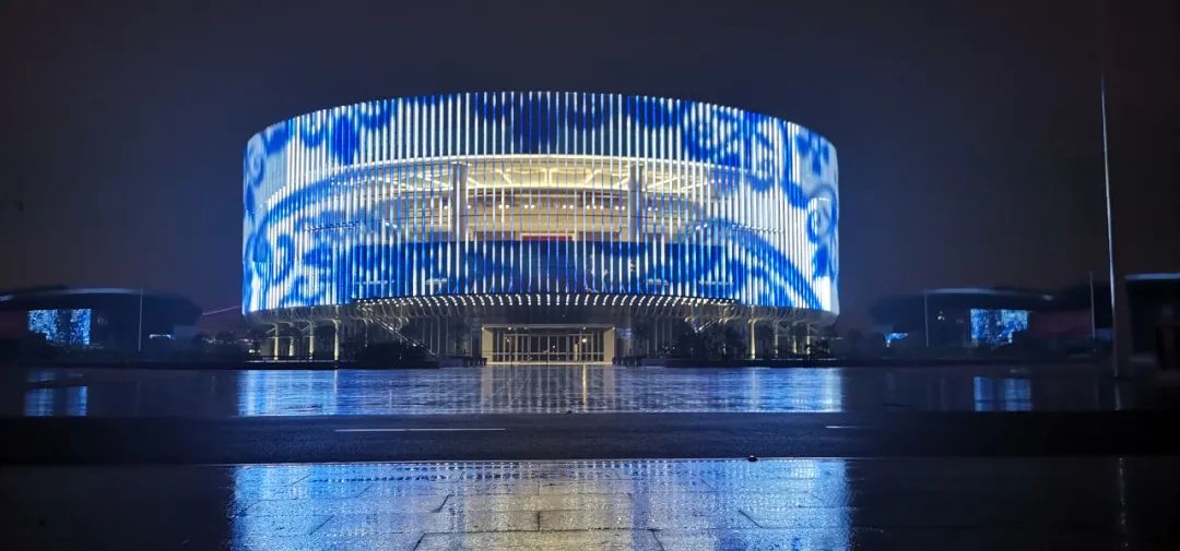 建筑简约的立面以轻盈的玻璃幕墙中和建筑敦实的体量,276等分的铝单板矩阵秩序排列,形成如风如水的柔美曲线,亦有着山峰一般的壮阔感。但这个玻璃幕墙也为灯具的安装增加了难度,为通过视觉效果充分延展到建筑圆环形立面,且在施工过程中全程跟踪管控,多次在夜间进行样板段试灯及指导安装,多次验证模拟计算校对,多次动画效果编排,最终呈现了《千里江山图》的画面,还增加了动态意境,满足设计要求。泛光照明的设计亮点体现在幕墙铝板侧面量身定制铝槽安装灯具,形成漫反射光效通过视觉效果充分延展到建筑圆环形立面。该项目夜景照明结合建筑结构分为外立面格栅、屋面、入口雨棚及伞状柱四个部分,规律的灯光排布让建筑充满美感,为游人营造出愉悦舒适的夜间光环境。国博会展功能完善提升工程项目已经全面建设完成并投入使用,且顺利进行了各种重大会议的召开和各项活动的举办。其中由光环境设计中心所负责的建筑泛光照明专项设计圆满的达到预期设计目标。项目建成后的建筑泛光效果不仅获得各层领导的肯定,在夜间已然成为了一扇武汉对外宣传的重要窗口。汉厅主入口方向正立面实景照片