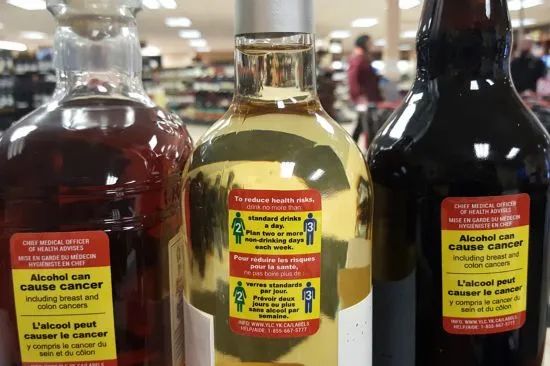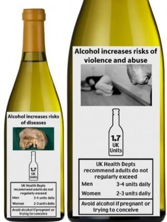 爱尔兰是欧盟国家内部第1个要求,对于葡萄酒贴上警告标签的国家,已经完成立法。在去年12月,爱尔兰就已经完成立法,任何酒精类商品的外包装上,必须贴上以下标签:“酒精导致肝脏疾病”,或者或“酒精与癌症直接相关”警告标语。类似下图的情况。