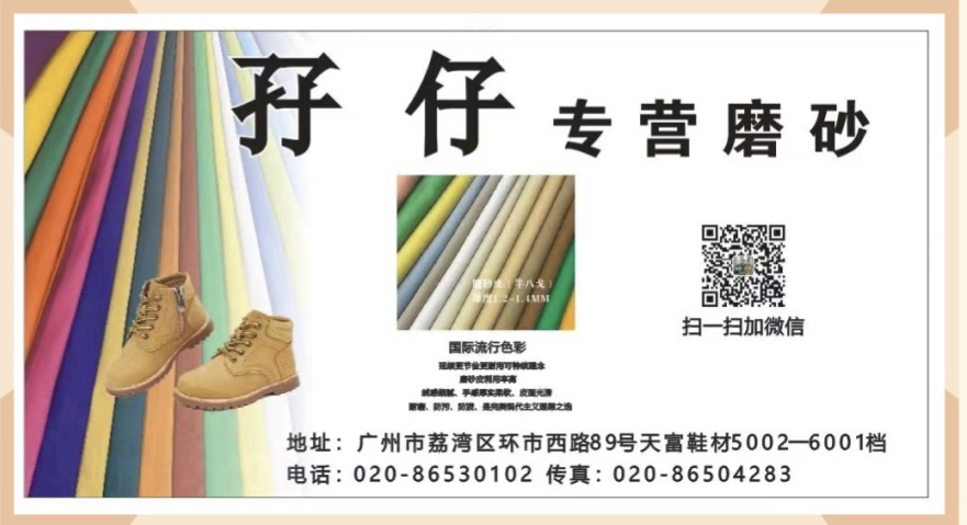 广州孖仔皮商行主要经营:磨砂皮(牛巴戈)、水晶系列磨砂、摔纹磨砂、压花磨砂、软修、全粒面、自然摔、打蜡皮。产品适用于,时装鞋、时尚手袋、家具、服装及各类时尚装修、装饰。公司管理层极为重视新产品的开发,同时公司有专业的开发和跟单人员可为客户提供的新样品开发,试板到大货生产。