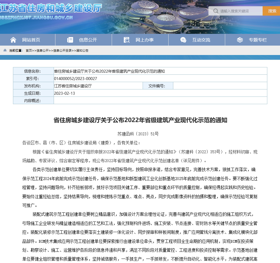 本次获批的“江苏省级建筑产业现代化示范”项目,经过了材料初审、现场踏勘、专家评议、综合审定等程序。其中,“BIM技术应用示范工程”要求在项目设计、施工、运营等阶段集成应用BIM技术,取得良好效果、建筑面积不低于5000平方米的民用建筑项目。