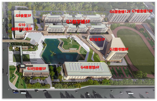 本工程建筑面积12.4万㎡,投资4.6亿元,主要由教学楼、图书馆、 行政楼、体育馆、会堂、宿舍、食堂、教办楼等配套附属用房组成。2021年6月开工建设,计划2023年6月完工。