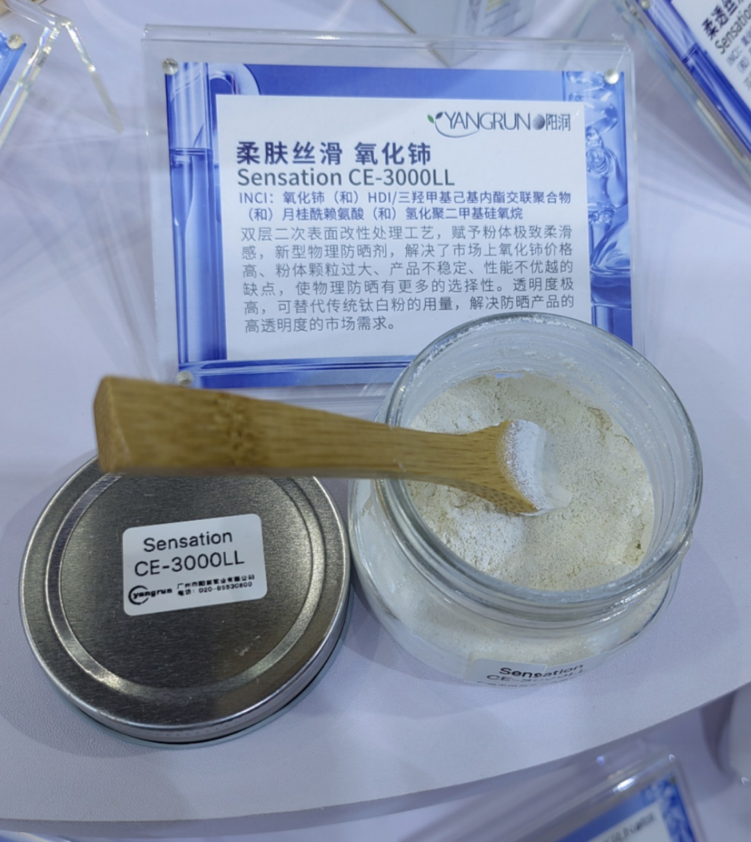 阳润公司独创新原料,产品型号:CE-3000LL来自进口氧化铈,先将液相法高分子化合物包裹,再进行双层二次表面改性处理,赋予粉体极致柔滑感,低吸油值,优异的防水能力,高亲油性,解决了市场上氧化铈价格高、具有二氧化钛相当的遮盖力,和抗uv能力,色调不苍白,更接近东方人肤质需要的白色效果,同时对粉底液抗暗沉能力发挥极大的帮助。