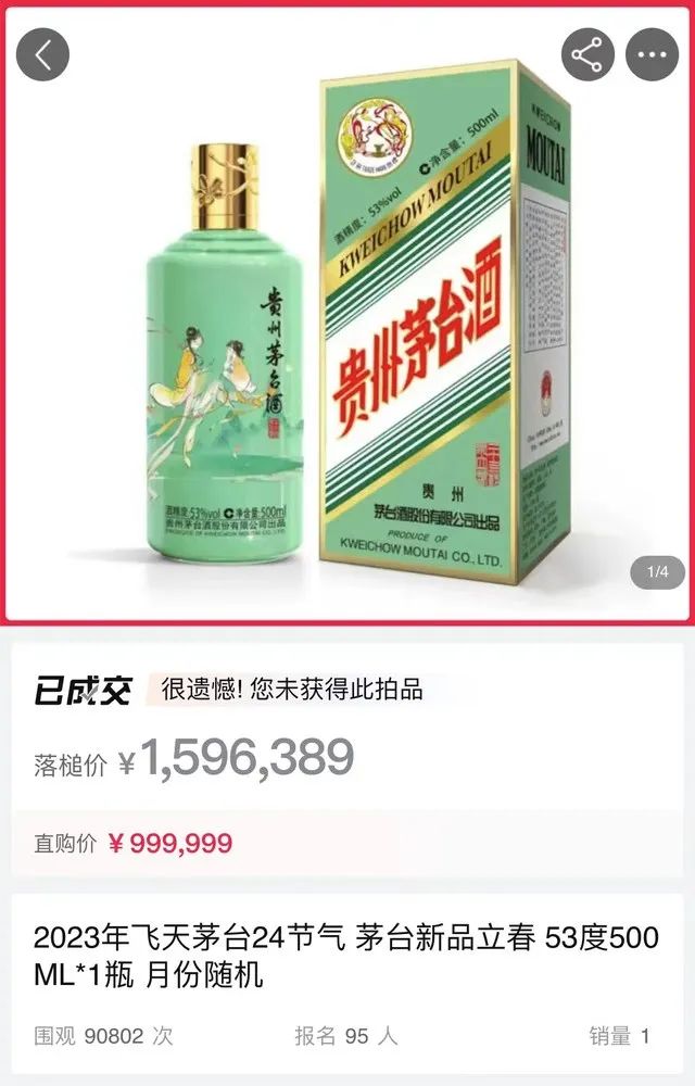 2月13日晚,茅台立春酒在阿里拍卖平台上进行拍卖,其中500ml茅台立春酒的成交价为391689元/瓶,100ml茅台立春酒的成交价位25088元/瓶;2月14日10时,在阿里拍卖平台上,500ml茅台立春酒起拍价为8889元/瓶,最终拍出1596389元/瓶。目前前茅台立春酒还在茅台的虚拟世界里“酿造”,仍未有任何官方信息显示立春酒的正式发售时间。并且,二十四节气茅台酒只在“巽风数字世界”发售,用户只有先用玩游戏的方式“酿造”二十四节气酒数字藏品,才能获得原价购买对应商品的资格,即获得“行权”资格。但即便获得行权资格,也只有等官方公布行权时间后,才可以行权、购得立春酒。