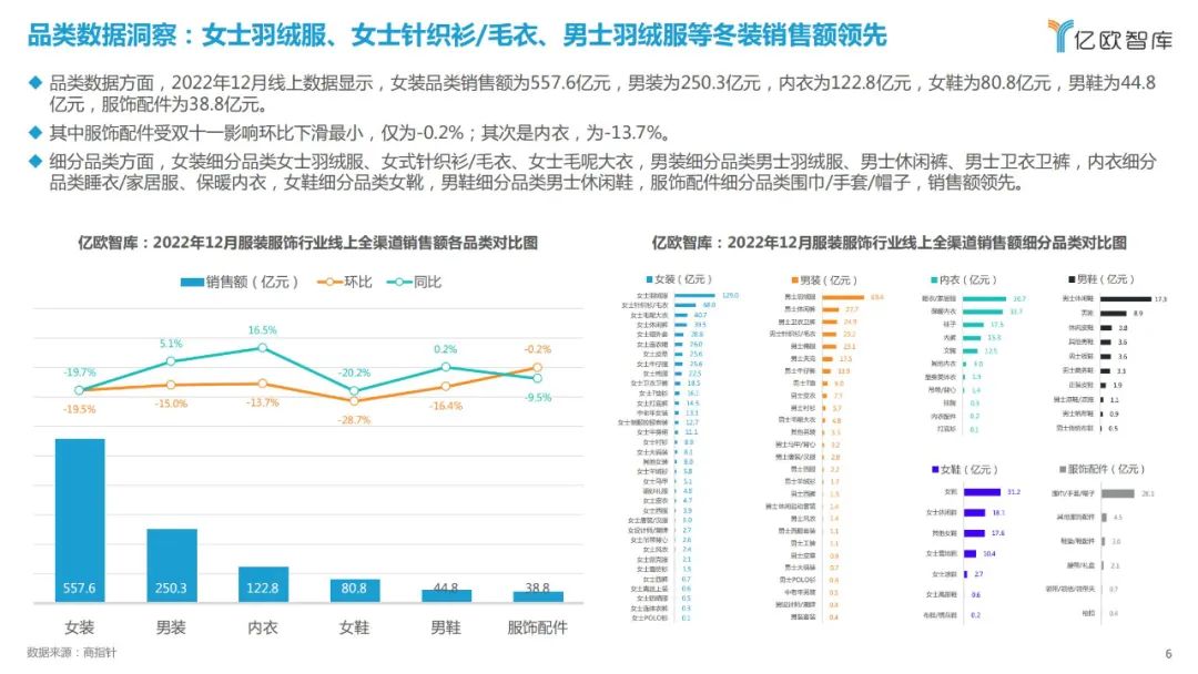 品类数据方面,2022年12月线上数据显示,女装品类销售额为557.6亿元,男装为250.3亿元,内衣为122.8亿元,女鞋为80.8亿元,男鞋为44.8 亿元,服饰配件为38.8亿元。