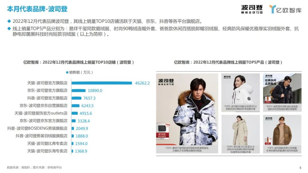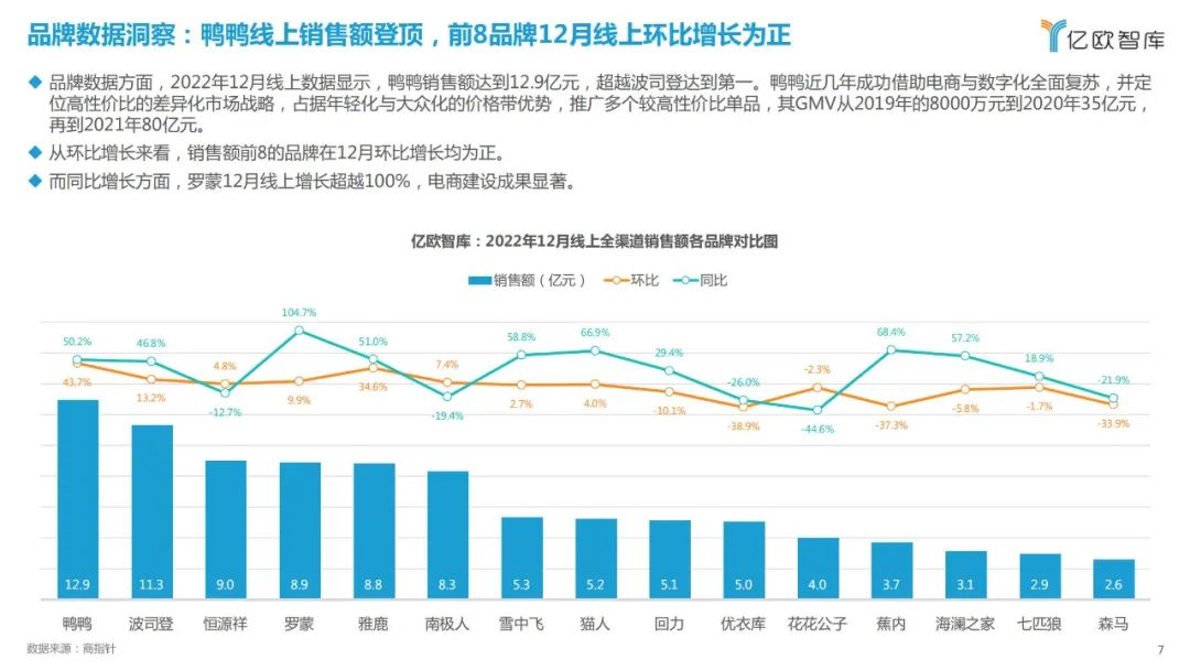 线上销售额品牌层面,鸭鸭达到12.9亿元登顶;即使受双十一拉高线上销售额影响,12月线上销售额前8品牌环比增长仍然为正。