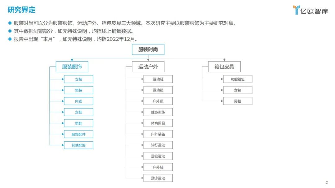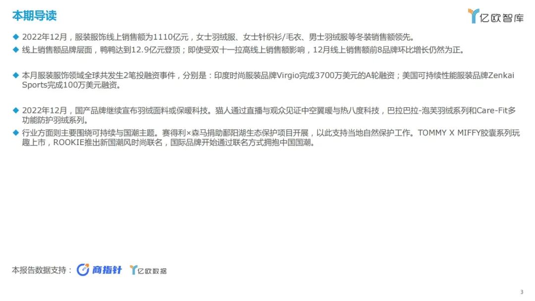 2022年12月,服装服饰线上销售额为1110亿元,女士羽绒服、女士针织衫/毛衣、男士羽绒服等冬装销售额领先。