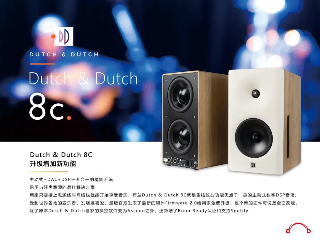 Dutch&Dutch 8C升级增加新功能;主动式+DAC+DSP+streaming四合一的系统;易用与好声兼顾的最佳解决方案。用家只要接上电源线与网络线就能开始享受音乐,荷兰Dutch&Dutch 8C就是集结这些功能优点于一身的主动式数字DSP音箱,受到世界各地的爱乐者、发烧友喜爱。
