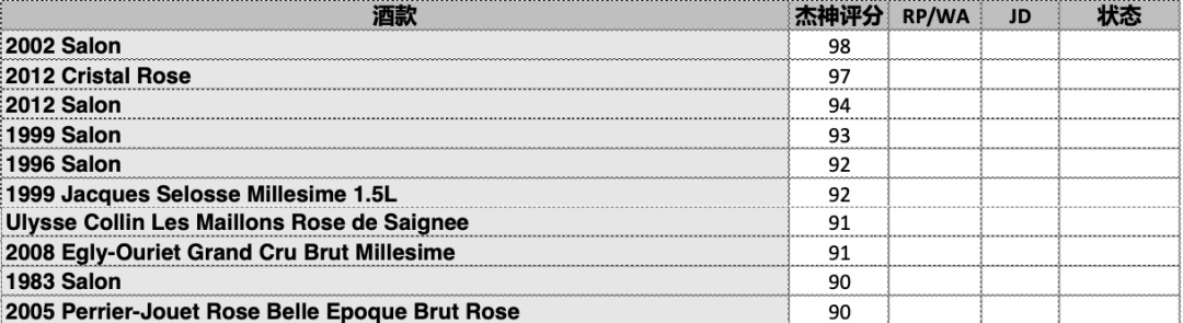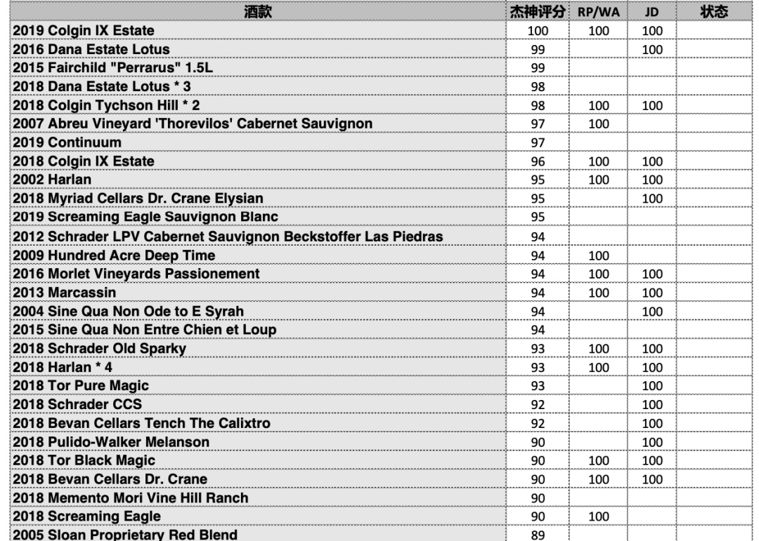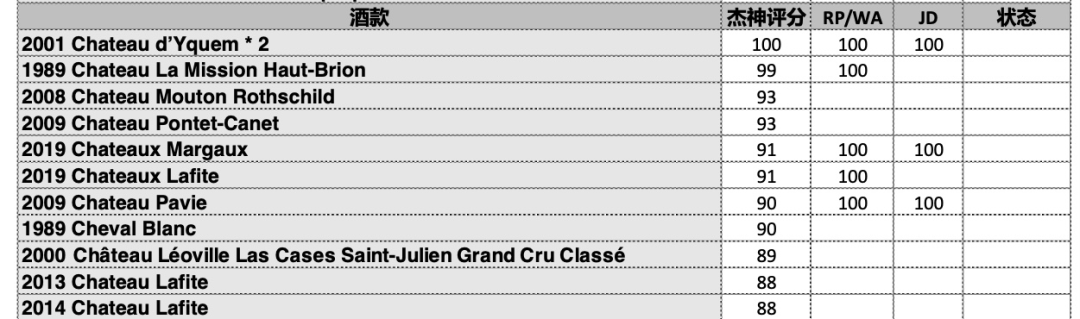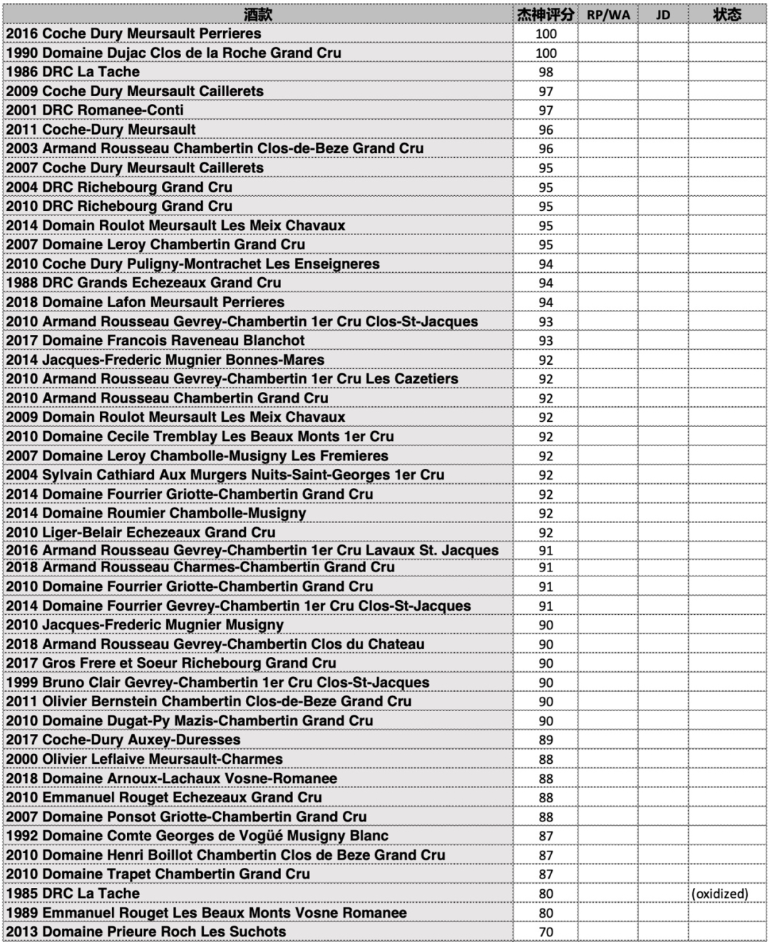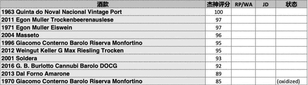 这一次的榜单跟以往一样采取满分制,直观的体现我对每一支酒的评价,同时附带了WA/RP以及Jeb的?酒标注,以及酒是否劣化的标注。