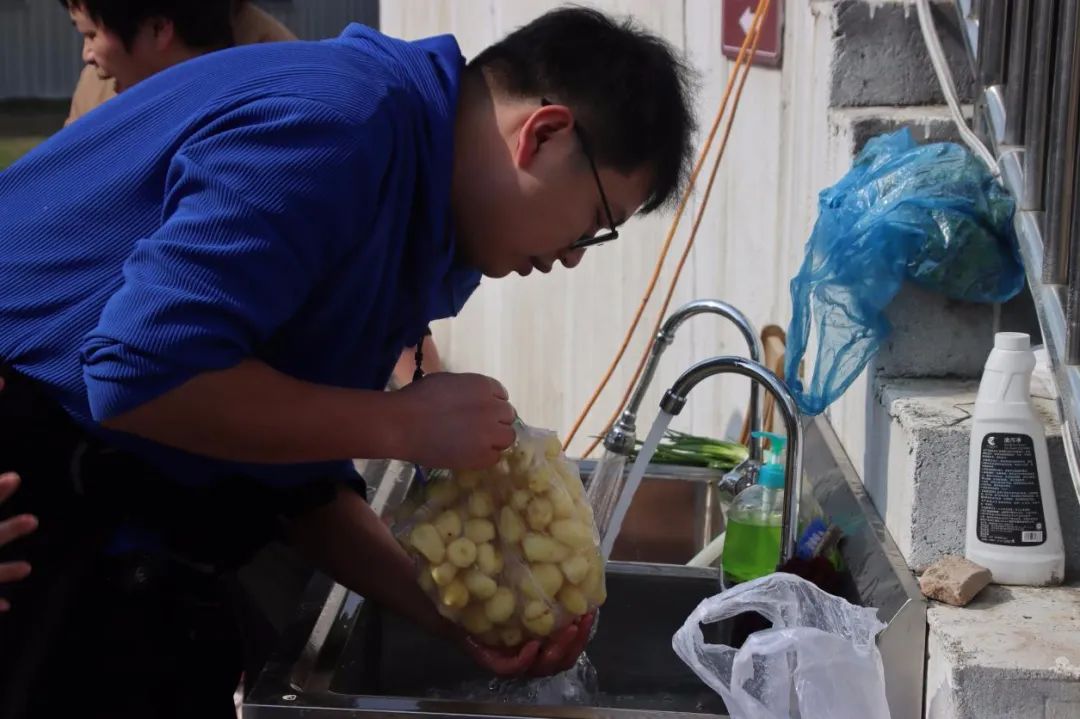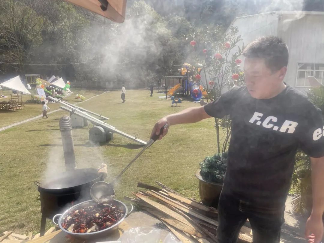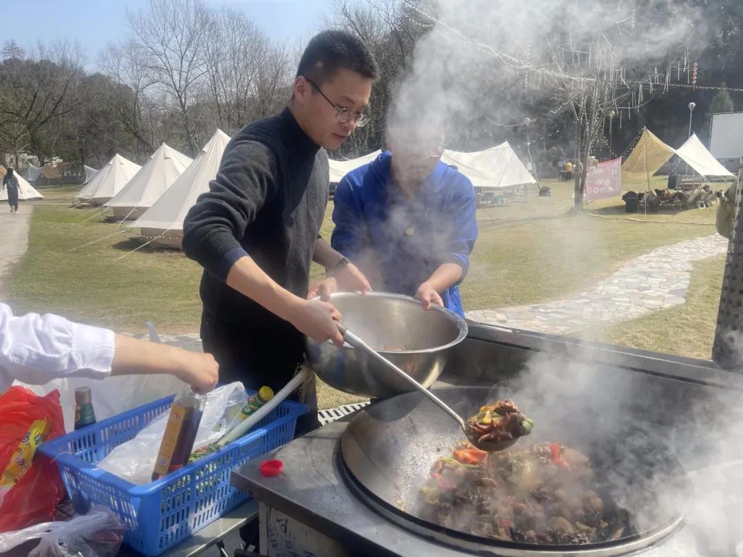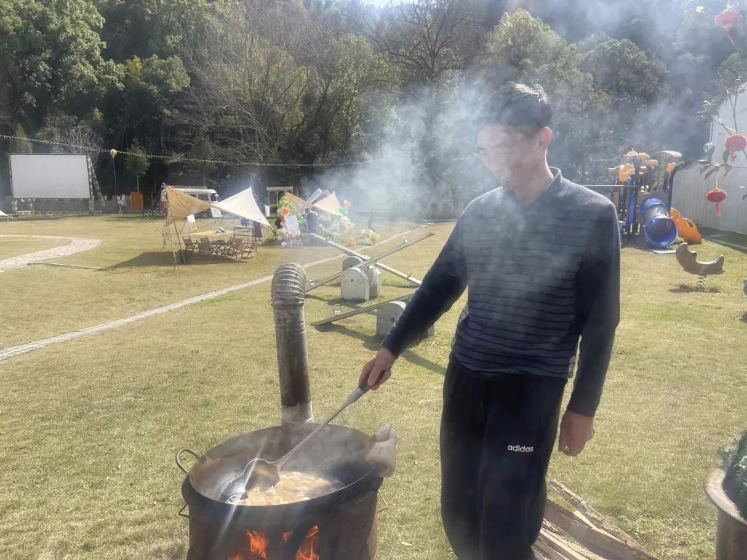此时各个灶台前的“大厨们”是绝对的C位,时不时“炫技”引来阵阵尖叫,吸引了各个组前来观摩打卡。阳光与炊烟相互交织,锅碗的碰撞声与大家的欢笑声互相交融。