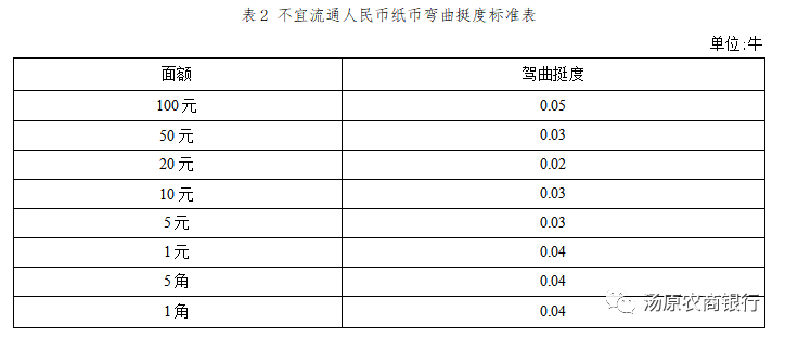 人民币纸币纸质变软、结构损坏,明显失去挺括度,按照人民银行规定的各面值人民币纸币采样点及检测方法,检测的人民币纸币的弯曲挺度值(不宜流通人民币纸币弯曲挺度值标准见表2),若人民币纸币弯曲挺度值小于或等于表2规定的弯曲挺度标准,为不宜流通人民币纸币。