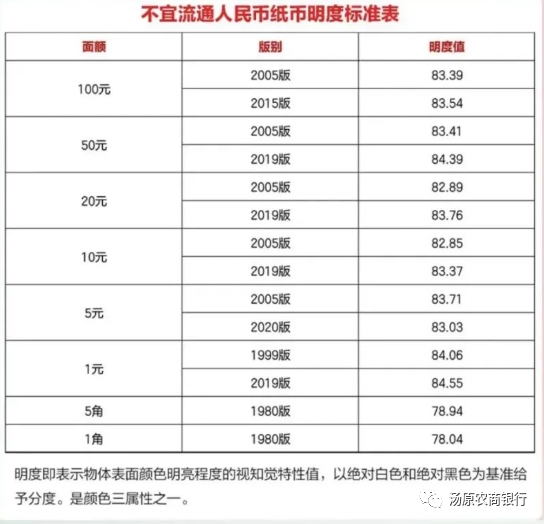人民币纸币在流通过程中自然磨损、老化,使票面整体颜色改变,按照《标准》附录规定的各面额人民币纸币采样点及标准中所规定的检测方法,检测人民币纸币的明度值,若人民币纸币的明度值小于等于《标准》附录表中规定的明度标准,为不宜流通人民币纸币。