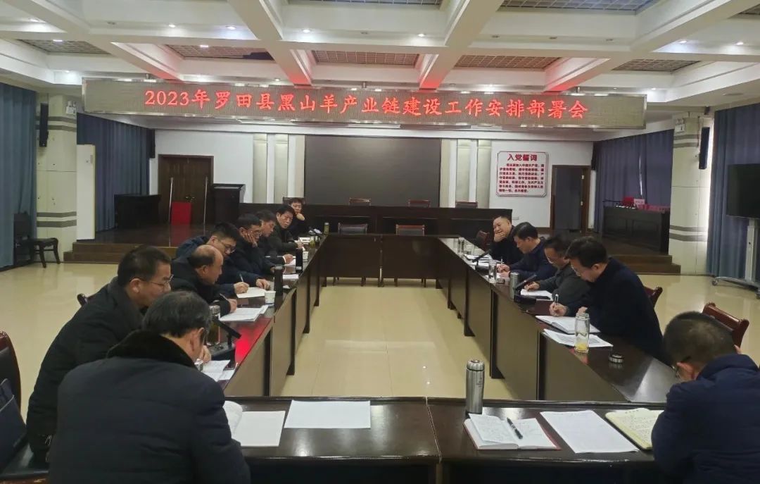 县一级调研员郭建明组织黑山羊产业链相关单位召开2023罗田县黑山羊产业链建设工作安排部署会,农投科技公司总经理陈初明参加。
