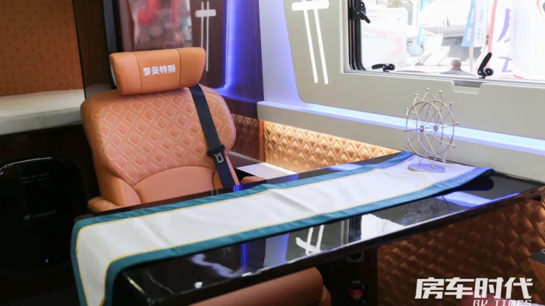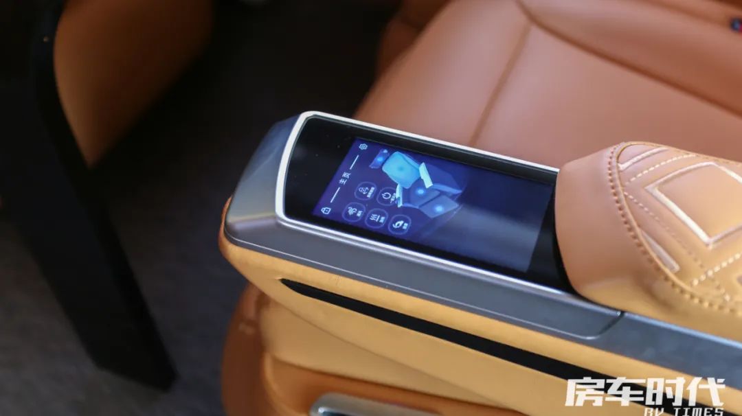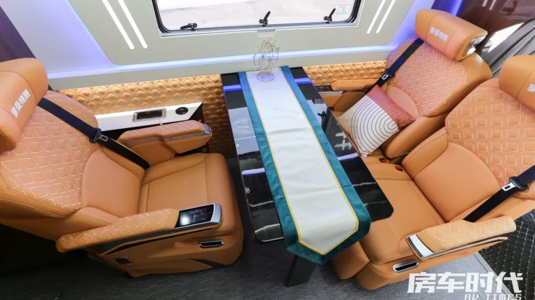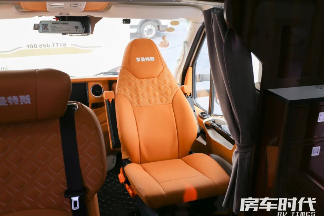 实拍车型采用了单人副驾驶的布局,罗曼特斯还为有需求的用户提供了双人副驾驶的选项。驾驶区以及乘客区均做了软包处理,悬浮驾驶座均配置有扶手,帮助缓解长途行车的不适感。