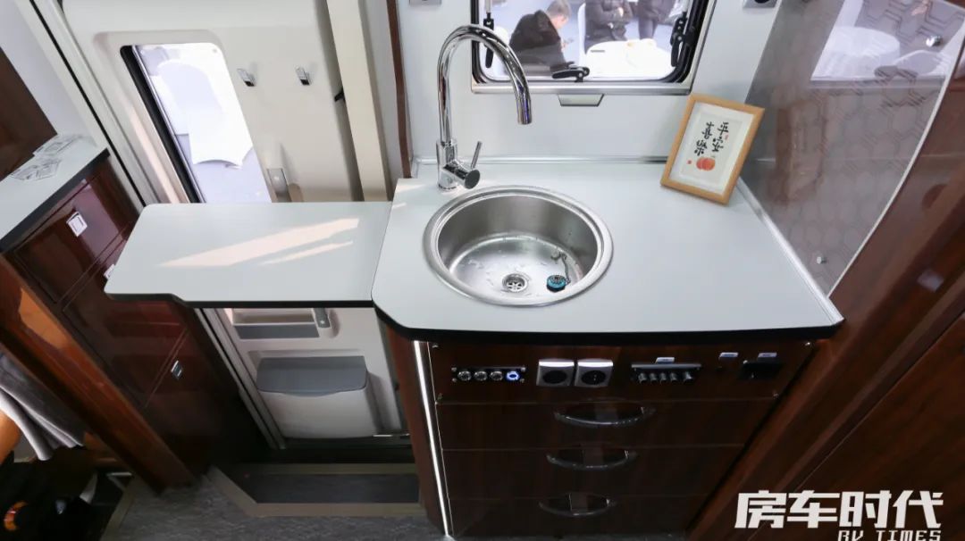 厨房区位于中门一侧,区域内配置有圆形水池,将侧面的桌板支起,可以增加制餐操作空间。