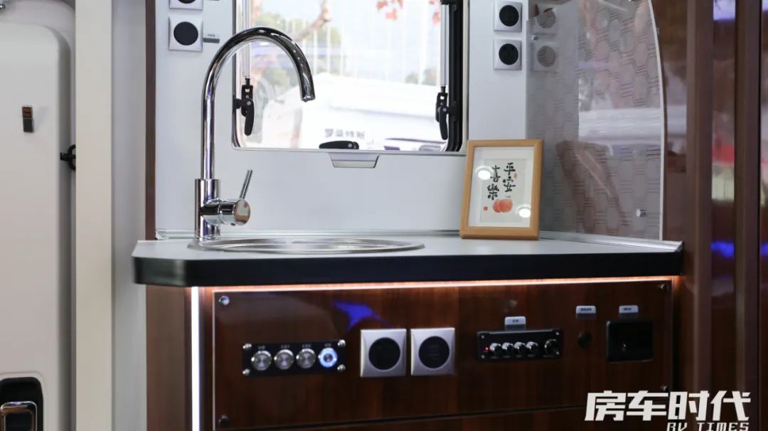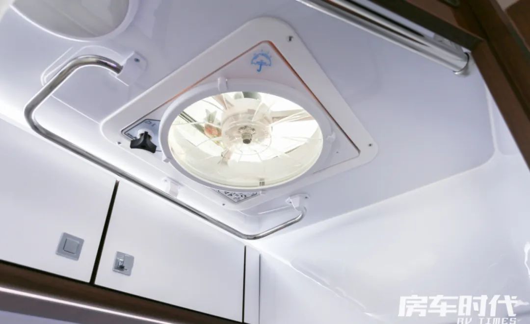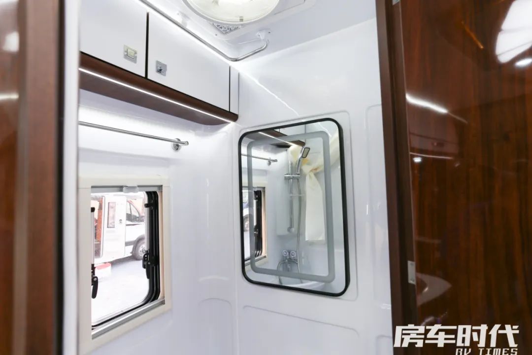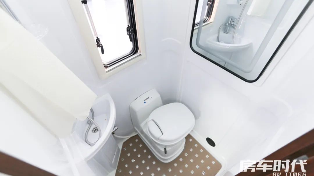 卫浴间为ABS吸塑一体式设计,配置了玻璃钢水池、独立花洒、淋浴踏板、晾衣架、智能镜、电动排风扇、进口赛特福德盒式马桶等,内部空间宽裕,使用感优秀。这款车还提供了丰富的选装项目,结合车友需求,打造专属旅居生活。