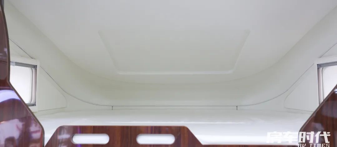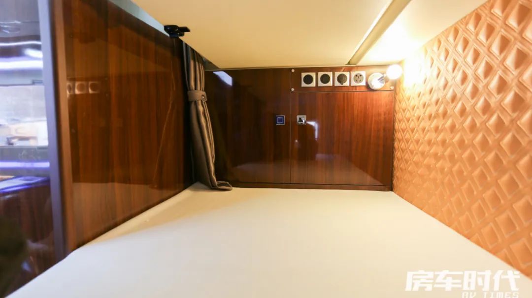 整体吸塑额头床的尺寸为2000×1430mm,700mm的区域纵向空间保障了睡卧的舒适性。床铺下方内嵌了一台鱼屏电视,匹配有功放音响套装,提升了旅居的趣味性。