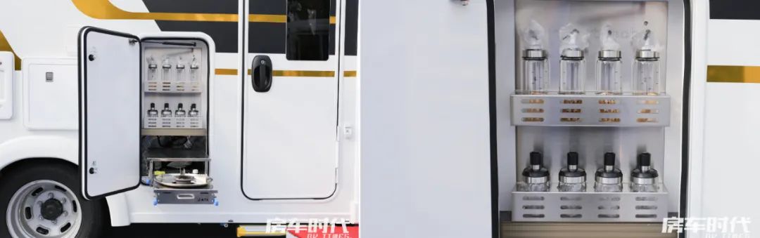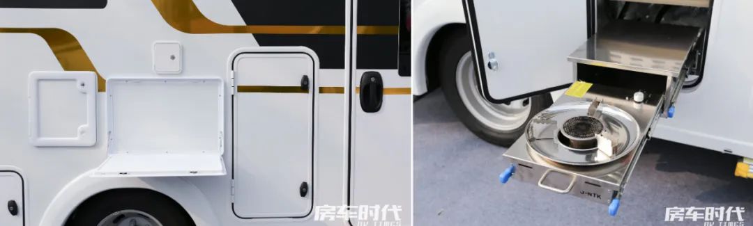 车身外侧配置丰富,配备了进口菲亚玛户外遮阳棚、高原版柴油灶+八孔调料架,能够帮助车友在户外快速搭建户外露营区以及制餐区,保障了车友们丰富的户外生活。此外,车厢外侧还配置有户外防水插座、户外七孔充电插座、户外加水管(15m)、220V外接电源充电线(15m)、驻车支腿、三孔拖车杠等。