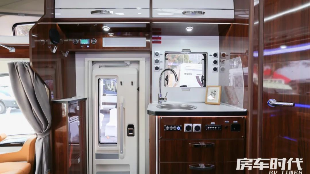 生活区整体采用了E0级环保板材,铺设有地毯式地板革,进门处做了鞋柜的设计,方便进出换鞋,保障生活空间的干净整洁。车辆配置了丰富的灯光系统,龙门飞甲顶灯炫酷大气,各个功能区细节处还配置了阅读灯、氛围灯带、触摸灯、背景灯,非常贴合居家环境。