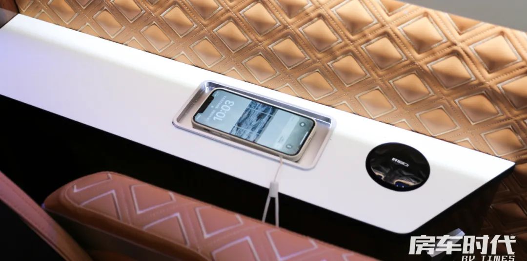 座椅旁侧配置了无线充电区,将可以无线充电的设备放置凹槽内即可自动充电,充电区下方是隐藏的储物区,可以收纳酒水饮品。会客区中间为多功能水转印固定桌,桌面下方空间宽裕,面对面会谈完全不会觉得局促。会客区上方吊柜内隐藏了一台格力1.5匹家用变频空调,提升了生活舒适性。