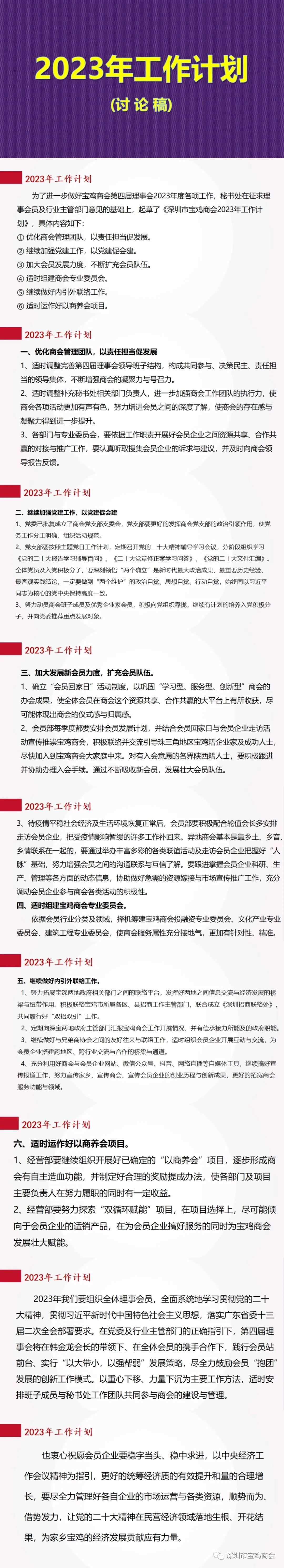 一、本季度要加大发展新会员力度,尤其是多发展大企业集团会员单位,尽可能扩充会员队伍;二、多联络珠三角地区宝鸡籍成功人士与宝鸡商会互动,进一步提升宝鸡商会在业内的影响力;三、确立“会员回家日”活动制度,以巩固宝鸡商会“学习型、服务型、创新型”商会的办会成果,使全体会员在商会这个资源共享、合作共赢的大平台上有所收获;四、本季度要多安排走访会员企业,把受疫情影响的工作补回来;五、依据会长办公会议(理事会)讨论通过的⟪深圳市宝鸡商会2023年工作计划⟫相关内容,着手筹建宝鸡商会投融资专业委员会、文化产业专业委员会、建筑工程专业委员会,使商会服务属性更加有针对性,更加精准。