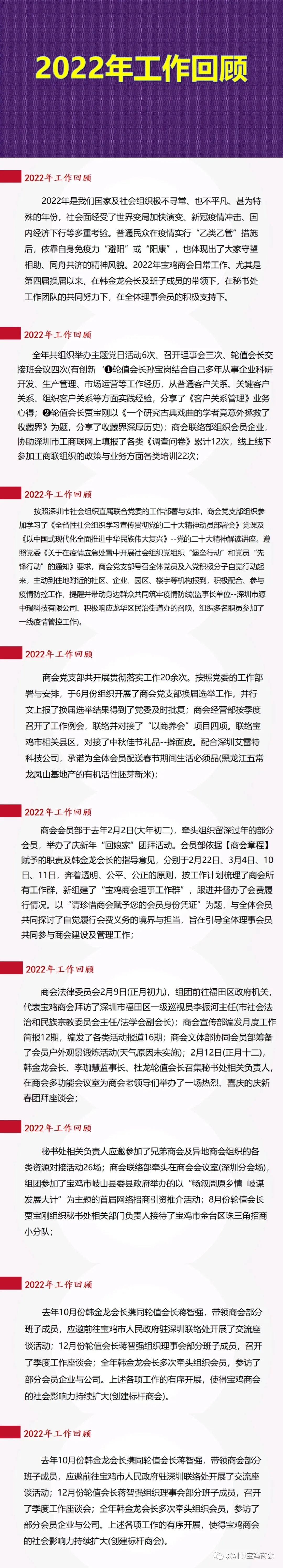 受韩金龙会长委托,雷周岐秘书长回顾了商会2022年度各项工作开展情况,并详细宣讲了宝鸡商会2023年工作计划讨论稿。