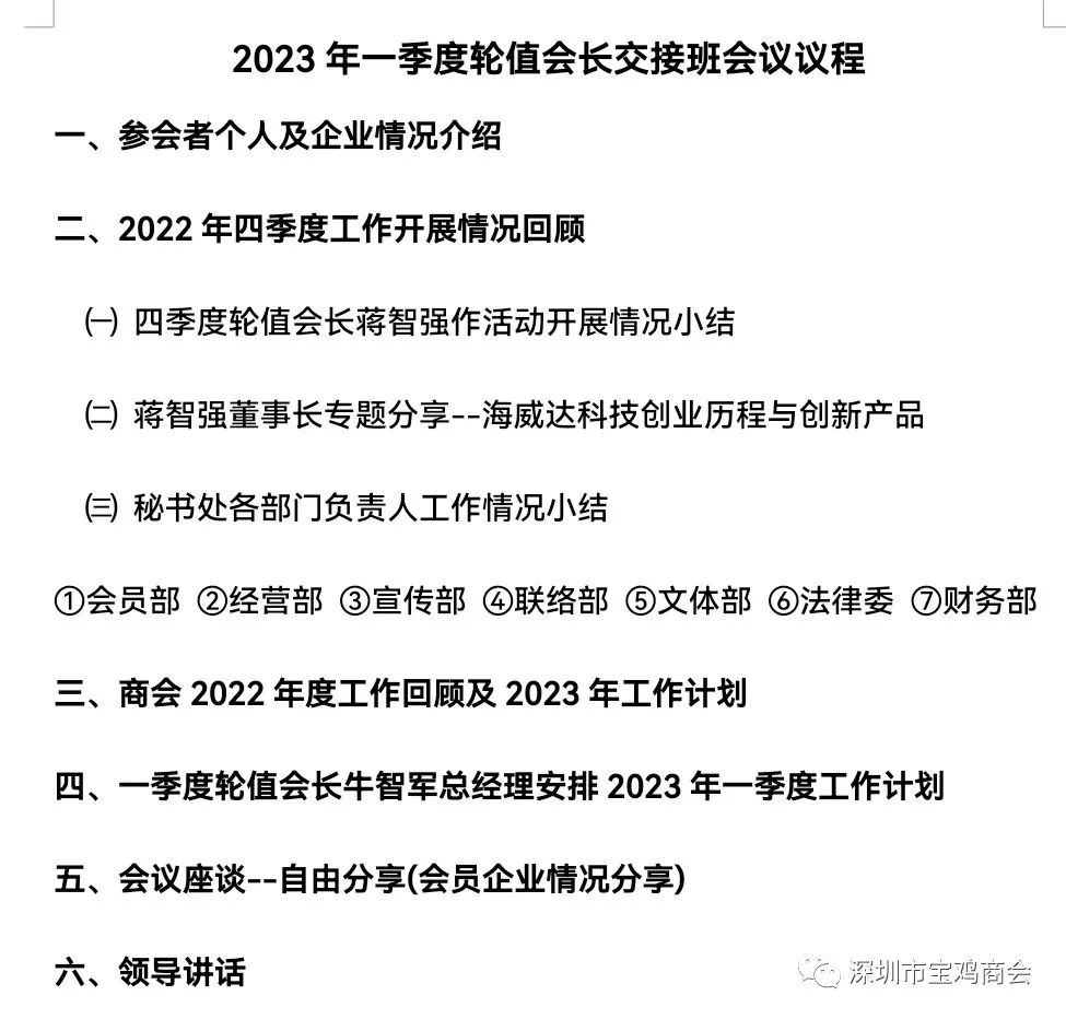 2023年2月18日,在商会七楼会议室召开了2023年一季度轮值会长交接班会议。2022年四季度轮值会长蒋智强,本季度轮值会长牛智军,执行会长兼秘书长雷周岐,执行秘书长白玉杰,法律委员会副主任田超超,副秘书长兼会员部长姚丽、副秘书长兼宣传部长张宝梅、文体部副部长吴红娟,商会理事卢掌乾、会员石继刚等相关部门负责人参加了会议。