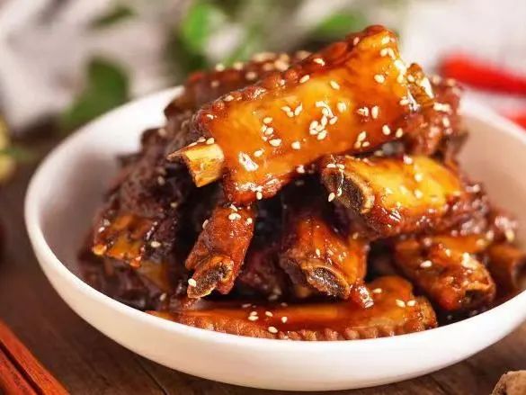米饭、糖醋小排、醋溜南瓜丝、元骨菠菜汤