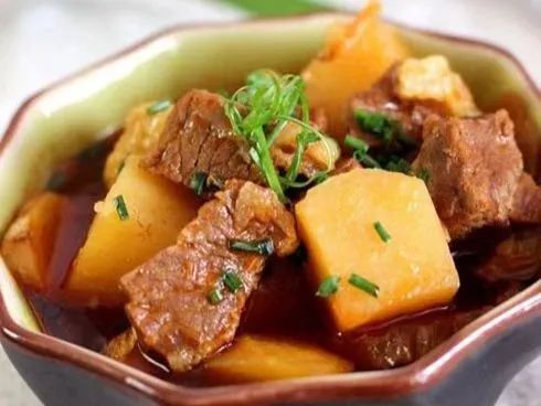 米饭、牛肉烧土豆、手撕包菜、牛骨豆芽汤
