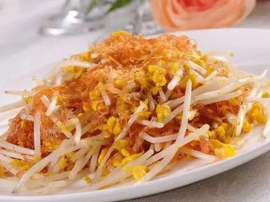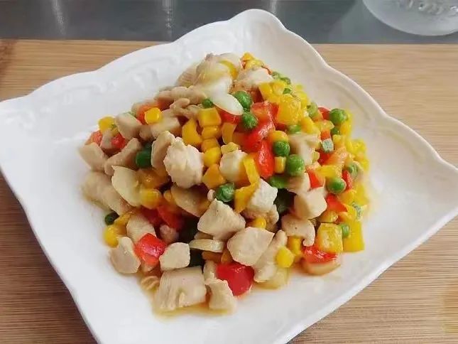 米饭、五彩鸡丁、粉丝银芽、紫菜蛋花汤