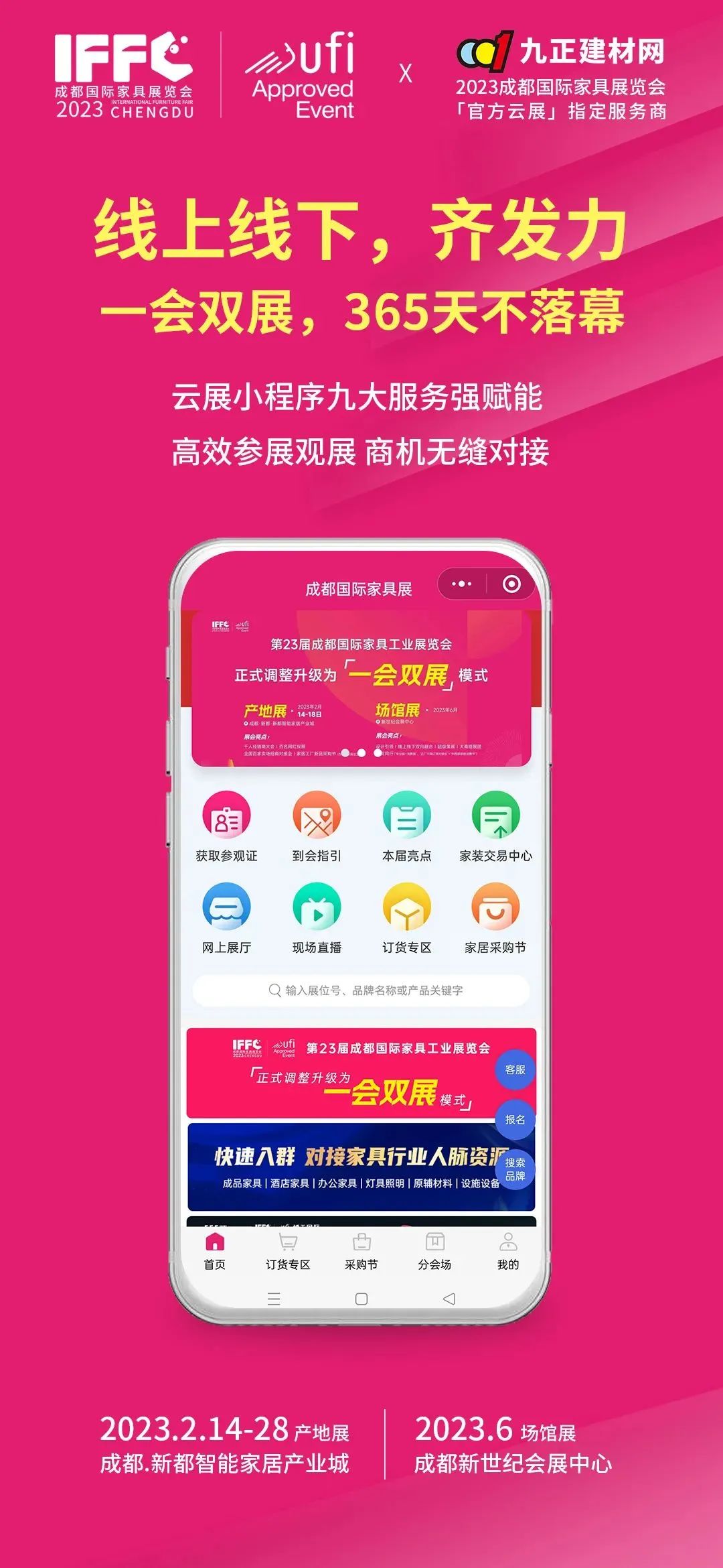 作为成都家具展创新打造展贸融合发展的重要载体,2023成都国际家具展云展小程序平台已正式上线运营。平台上线后,将持续为国内外客商提供更丰富的亮点活动、全新工艺、行业趋势、时尚设计、招商加盟政策等前沿资讯,并构建一站式线上采购合作平台。