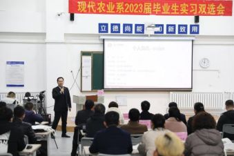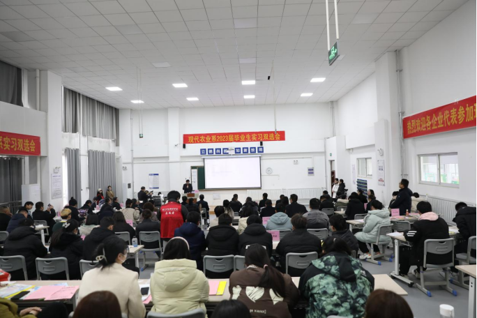为扎实做好2023届毕业生的实习就业工作,2月18日,现代农业系首届毕业生实习“双选会”成功举办。学院党委委员、社会培训中心主任杨自军,学生工作处处长张峰,教学科研处副处长石罗、招生就业处副处长彭洪林等与会指导。来自全国各地农业领域的17家企业代表、现代农业系领导班子及教职工代表、2023届全体毕业生共计近200人参加双选会。