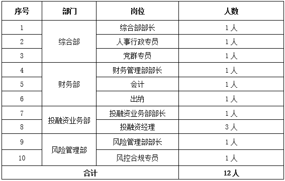 农投公司本次招聘人员12人。招聘部门包括综合部、财务部、投融资业务部和风控管理部4个部门,其中,部门负责人4人,普通员工8人,具体岗位如下: