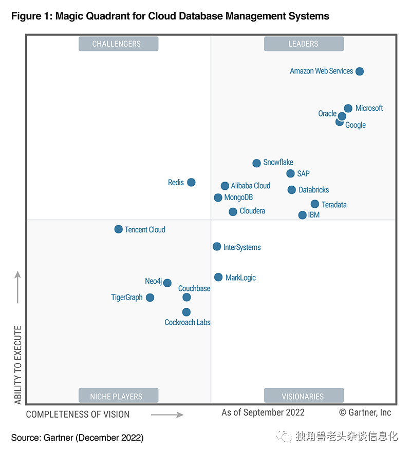 2022 年 Gartner Magic Quadrant for Cloud Database Management Systems (DBMS) 将Teradata评为数据分析领域的领导者。连续 20 年被评为领导者,从技术层面来Teradata,在数据湖、数据仓库、分析以及新的数据源和类型与混合型多云计算环境中都有着独到见解,特别是在企业级市场上,拥有独特的核心竞争力与行业解决方案。